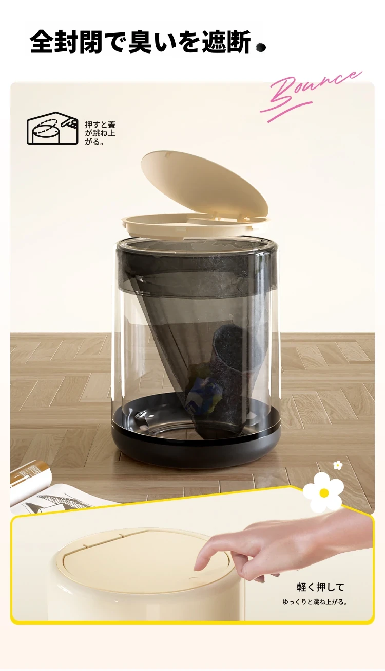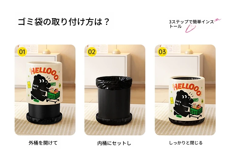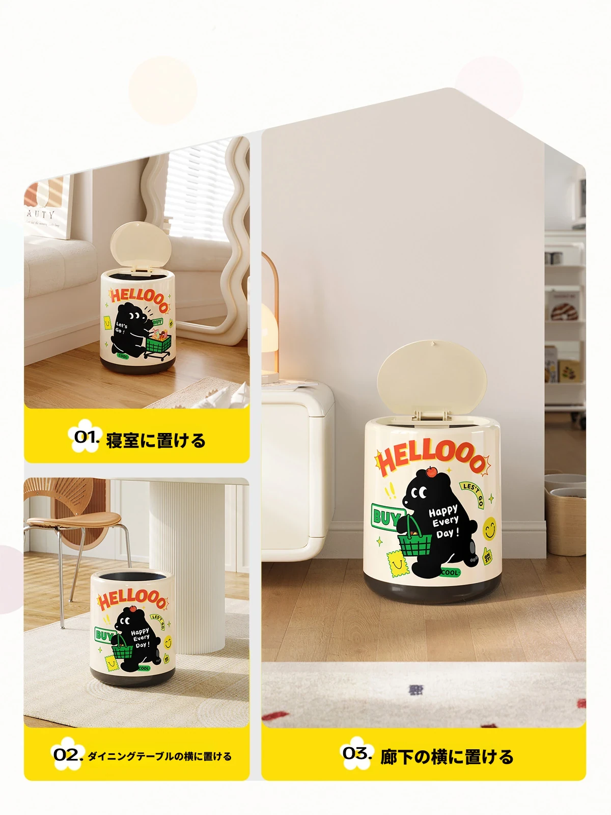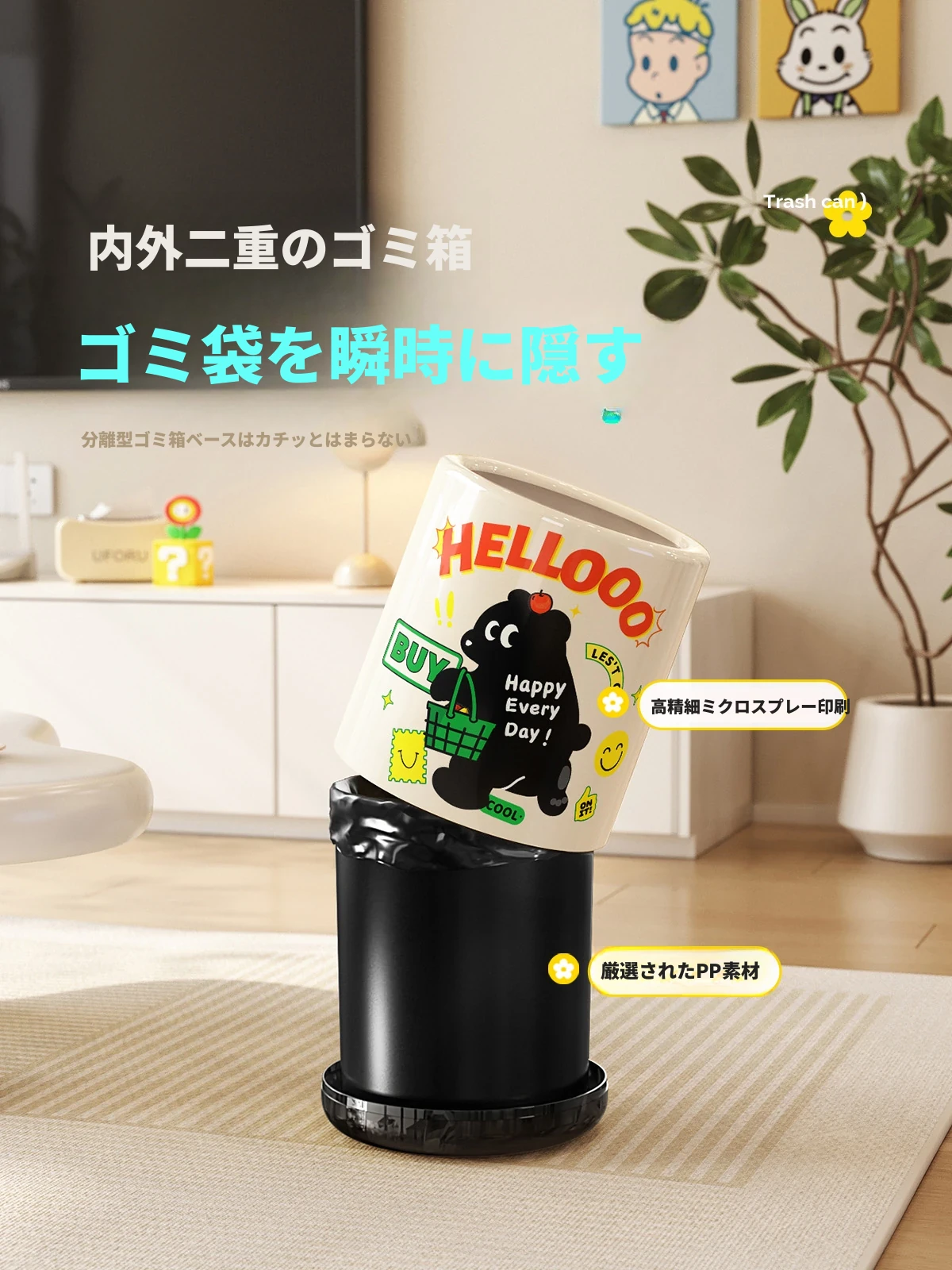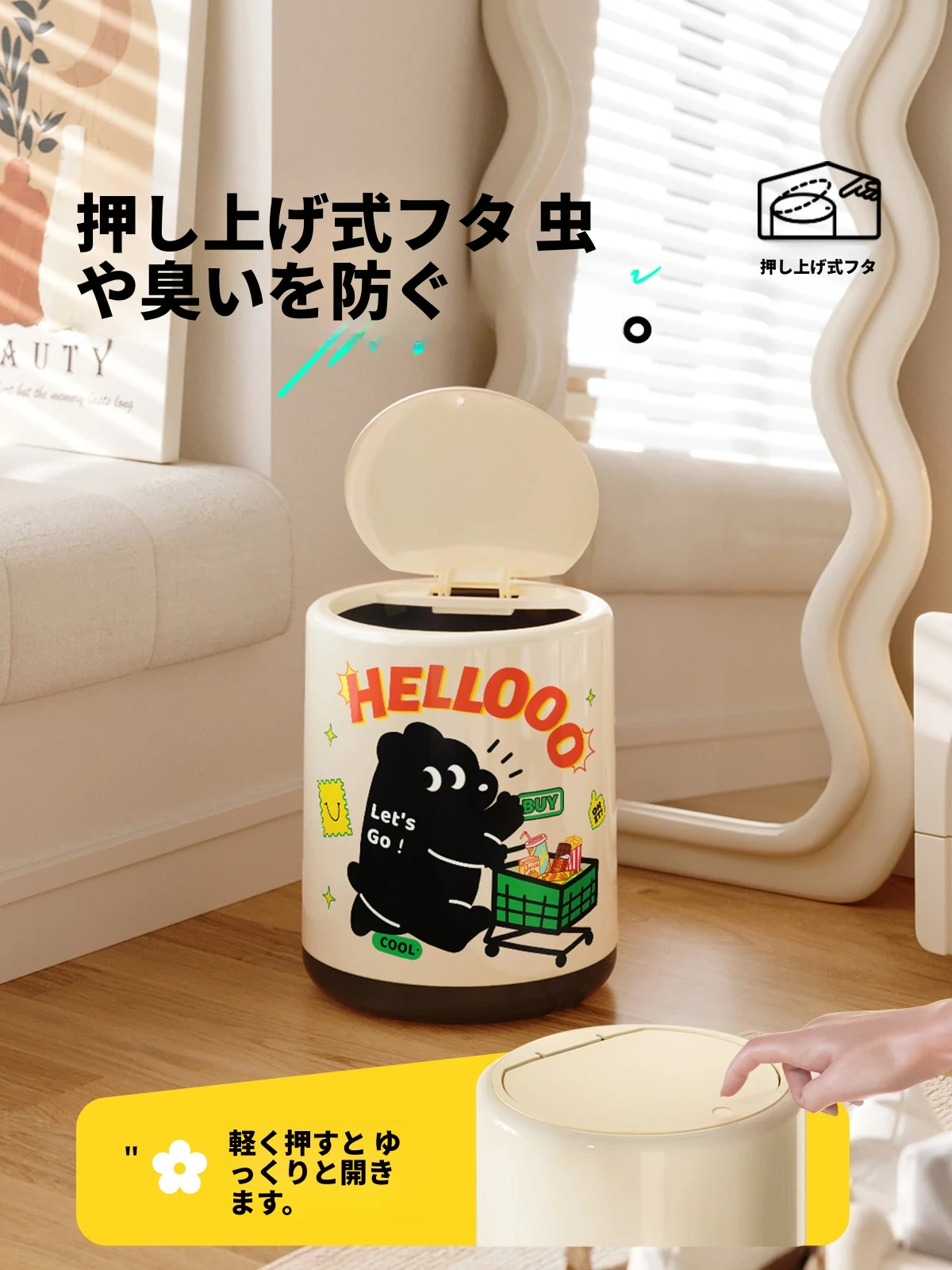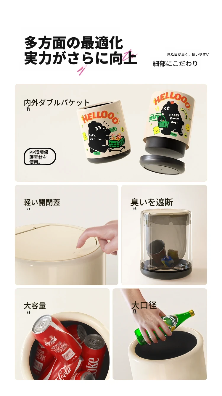 メイシダ創意ゴミ箱|可愛いカートゥーンデザインのプッシュ式蓋付き|リビングやバスルームにぴったりな収納バケツで、楽しくお片付け!